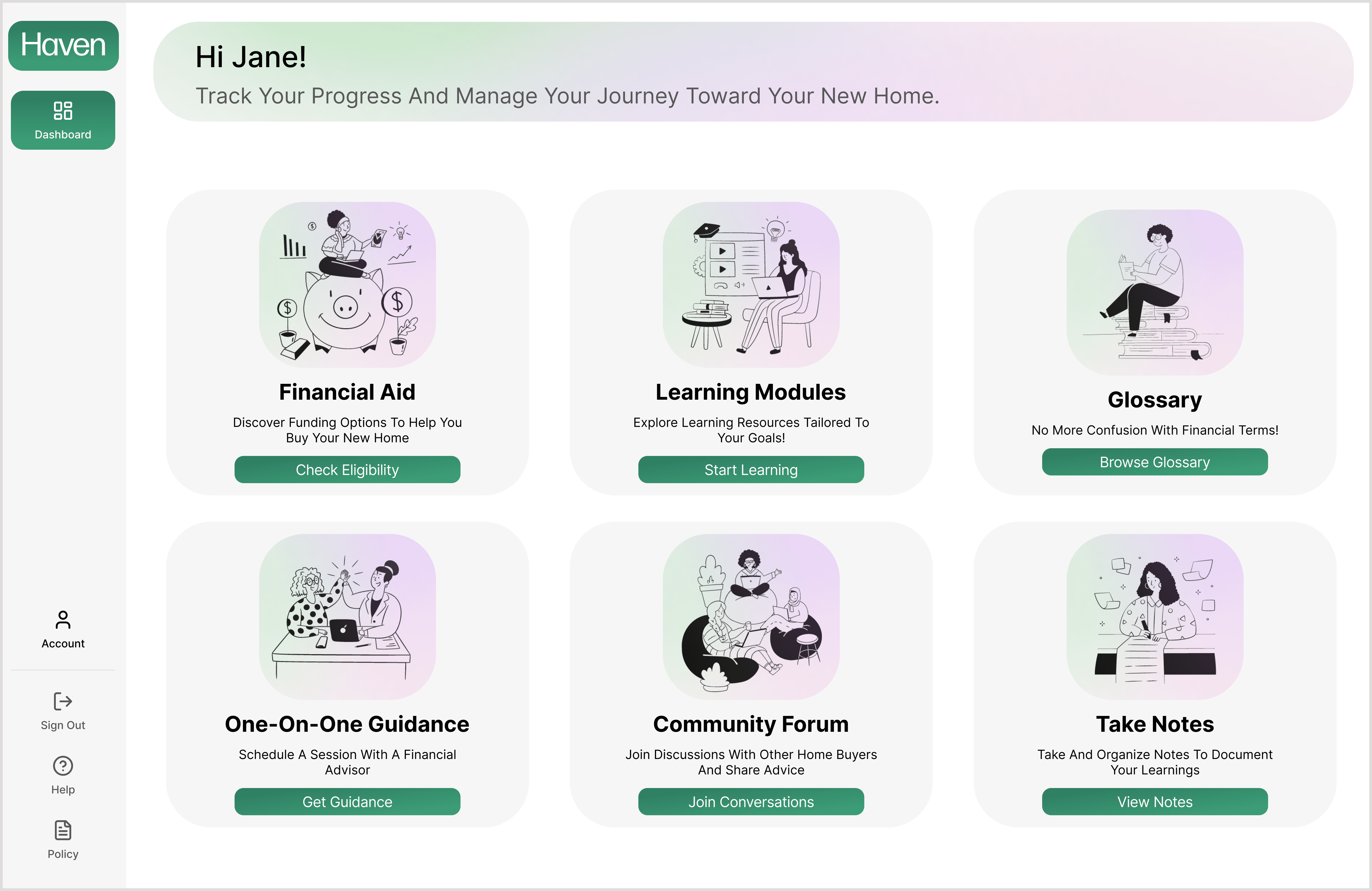 Buying a home should feel exciting, not intimidating. Haven is a personalized financial dashboard designed to help women feel informed, supported, and confident throughout their homebuying journey, with clear learning resources, expert guidance, financial aid, and a community that understands them.